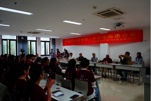 10月16日15:30,电子竞技博彩 汉语言文学类193班“不忘初心追梦想、牢记使命谱青春”主题班会在恕园23号楼206召开。校党委副书记王利琳出席班会并为同学们上了一堂生动的初心使命思政课。省委“不忘初心、牢记使命”主题教育第十二巡回指导组成员郑锋,校党委学工部部长(学生处处长)何军,庆祝新中国成立70周年纪念章获得者、电子竞技博彩 老党员殷作炎,学院党委书记诸英,学院党委副书记管庆江,班主任郭洪雷,以及学院全体辅导员老师应邀参加班会。