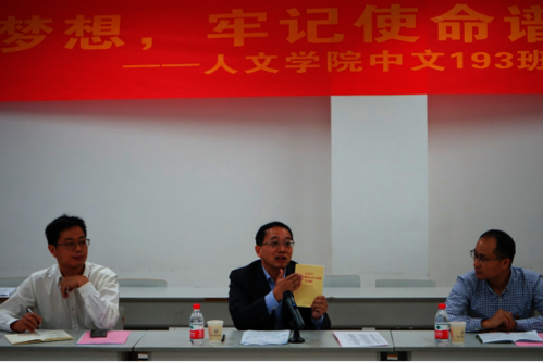 结合亲身亲历,殷作炎围绕做人和做事,从目标道路和思想方法等两个方面谈了自己的初心使命和感悟体会。中文193班学生代表陈辉和古丽孜巴同学分别讲述了自己的爱国心、奋斗情、报国志。