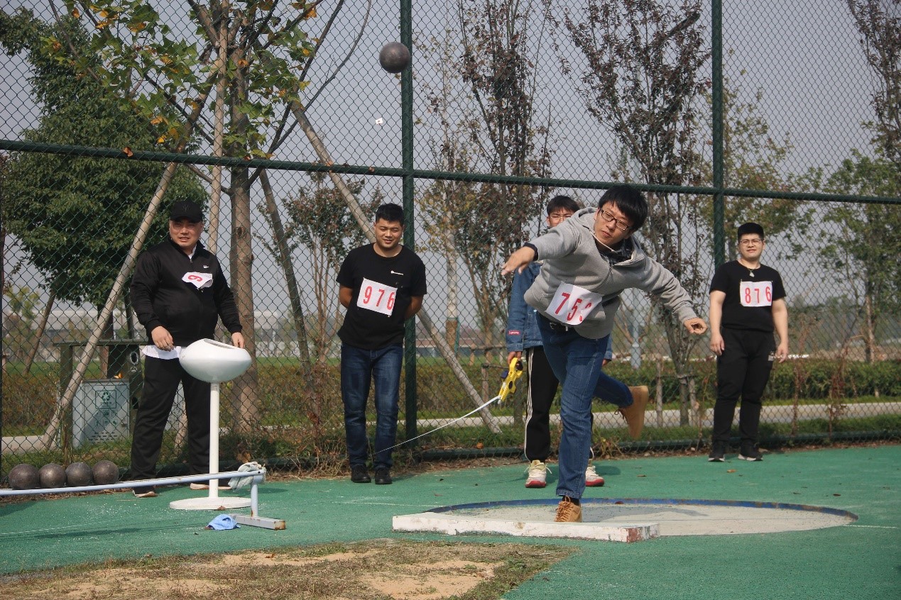 在比赛中,两位老师手握铅球,虽有几分辛苦,但他们淡定从容,汇集全身的力量,奋力投掷。一道道优美的弧线从众人眼前划过,落在竞赛场上,留下精彩的痕迹、努力的结果。